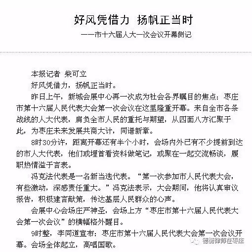 山东德衡(枣庄)律师事务所冯克法律师作为新当选的人大代表,在本次大会上成为枣庄市第十六届人民代表大会法制委员会委员,所提建议也被大会简报采用,充分体现了律师代表积极参政议政,忠实履行职责的代表风范。