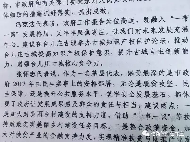 当听到台儿庄农民黄春燕代表通过加工珍珠包带领6000余名贫困户脱贫致富的先进事迹后,冯克法律师代表德衡枣庄所当场承诺愿意利用我所的知识产权服务优势,为黄春燕代表的企业无偿提供全部知识产权服务,帮助农民脱贫致富。
