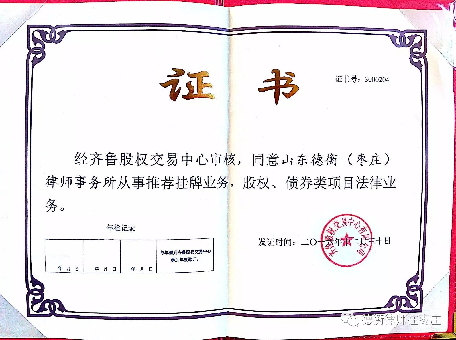 近日,经齐鲁股权交易中心审核,山东德衡(枣庄)律师事务所正式取得齐鲁股权交易中心“推荐机构”资格(证号3000204),这是目前枣庄市一家取得推荐资格的中介机构,标志着德衡枣庄所的资本证券业务服务水平再上新台阶。 齐鲁股权交易中心中介机构分为普通机构会员和推荐机构会员,推荐机构会员必须在机构规模、人员素质、服务业绩等方面达到一定标准后方能取得。律师事务所取得推荐机构资格,除了能够为企业股权挂牌转让、债券发行等项目提供法律意见的基本服务,还具备以推荐机构身份直接出具股权转让说明书和债券募集说明书的资格,直接主导运作项目全过程。 目前,山东德衡(枣庄)律师事务所作为推荐机构已经分别完成山东清大银光金属海绵新材料股份有限公司、枣庄和众信息科技股份有限公司在齐鲁股权交易中心的科技板、众创板挂牌,其中山东清大银光金属海绵新材料股份有限公司是枣庄市一家科技板挂牌企业。 2016年下半年以来,德衡枣庄所积极响应枣庄市政府号召,参与了多家企业股份制改制工作,推动了部分企业成功对接资本市场,资本证券业务走在了全市前列,综合法律服务水平不断提高。
