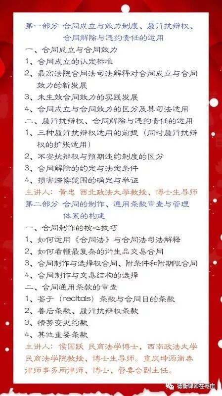 京盛凯枣庄法律培训中心第七期培训“合同实务(制作、通用条款审查、效力制度、履行抗辩权、合同解除、违约责任的运用等)”将于12月23日-24日(本周末)在我所视频会议室举行,西北政法大学教授、博士生导师黄忠,西南政法大学教授、博士生导师侯国跃将进行精彩授课。