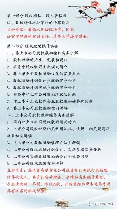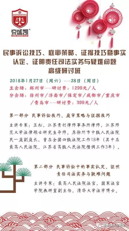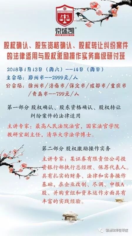 京盛凯枣庄法律培训中心第八期培训“股权确认、股东资格确认、股权转让纠纷案件的法律适用与股权激励操作实务”将于2018年1月13日-14日在我所视频会议室举行,最高人民法院法官、国家法官学院教研室副主任、清华大学法学博士及某证券有限责任公司投资银行部执行总经理、保荐代表人将进行精彩授课。