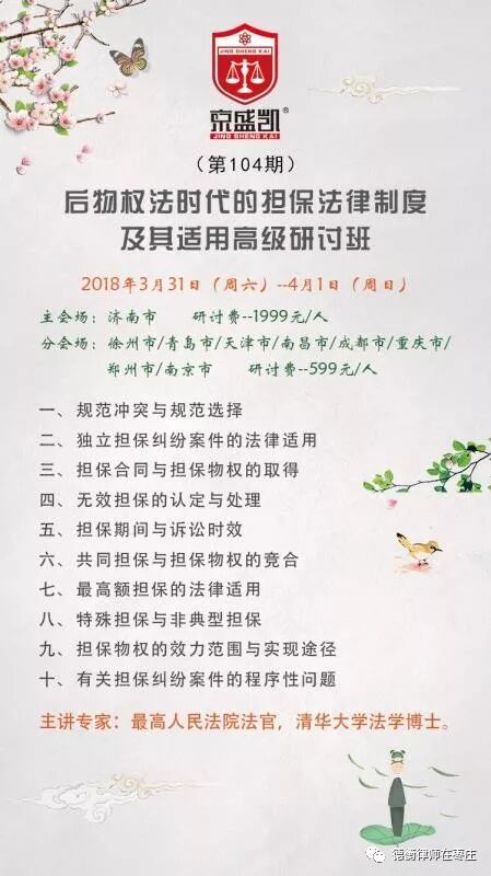 京盛凯枣庄法律培训中心第十一期培训“后物权法时代的担保法律制度及其适用研讨班”将于3月31日-4月1日在我所视频会议室举行,最高人民法院法官将进行精彩授课。