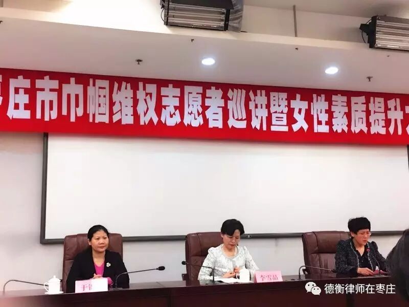 2017年3月8日上午9时,“枣庄市巾帼维权志愿者巡讲暨女性素质提升大讲堂”活动在枣庄市市政大厦举行。本次活动由枣庄市妇联、枣庄市综治办、枣庄市法制办、枣庄律师协会、枣庄市维权志愿者协会等单位联合举办。