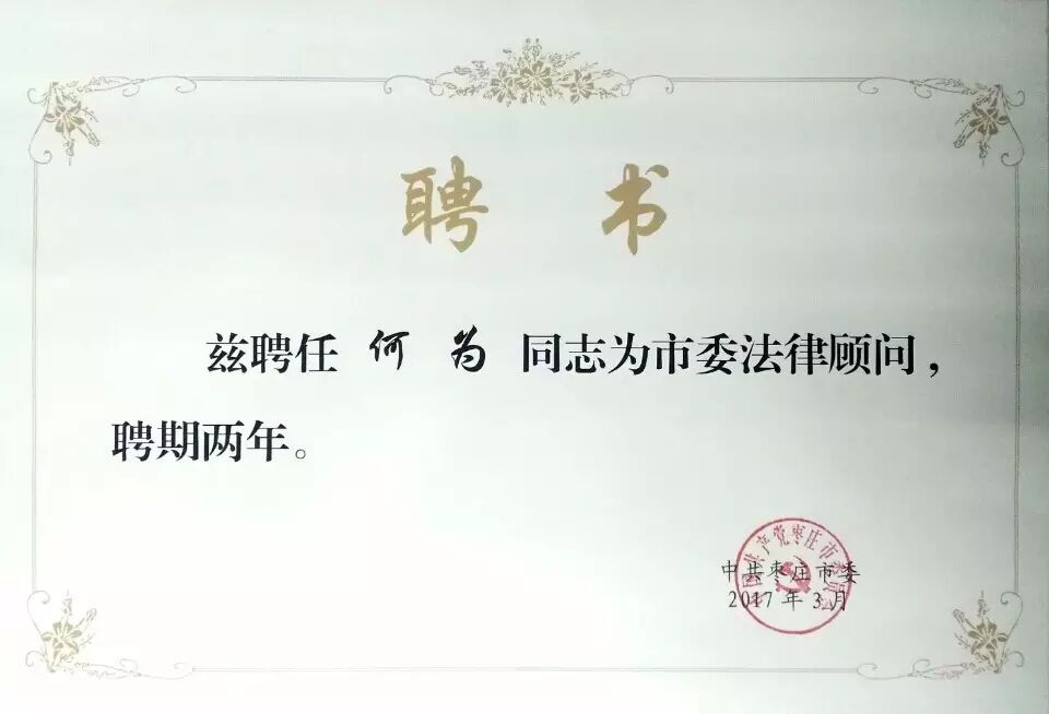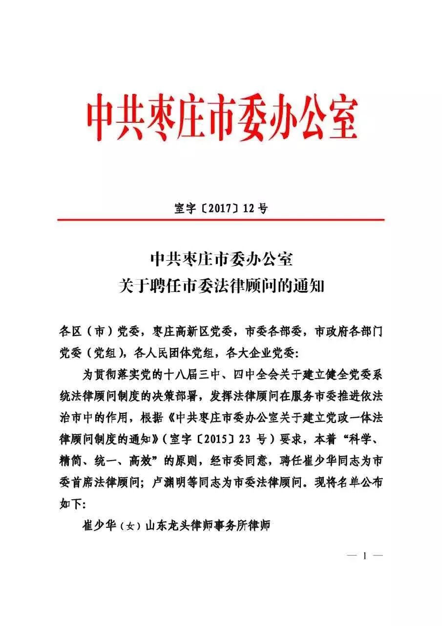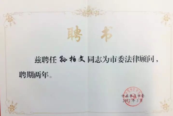会议宣读了《中共枣庄市委办公室关于聘任市委法律顾问的通知》,我所冯克法、孙柏文、何为三位律师获聘为首届中共枣庄市委法律顾问。崔少华、李君友、冯克法、秦元洙、杨鹏五名法律顾问代表参加了市委法律顾问的聘任仪式。