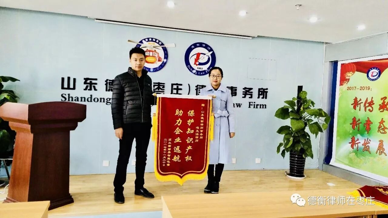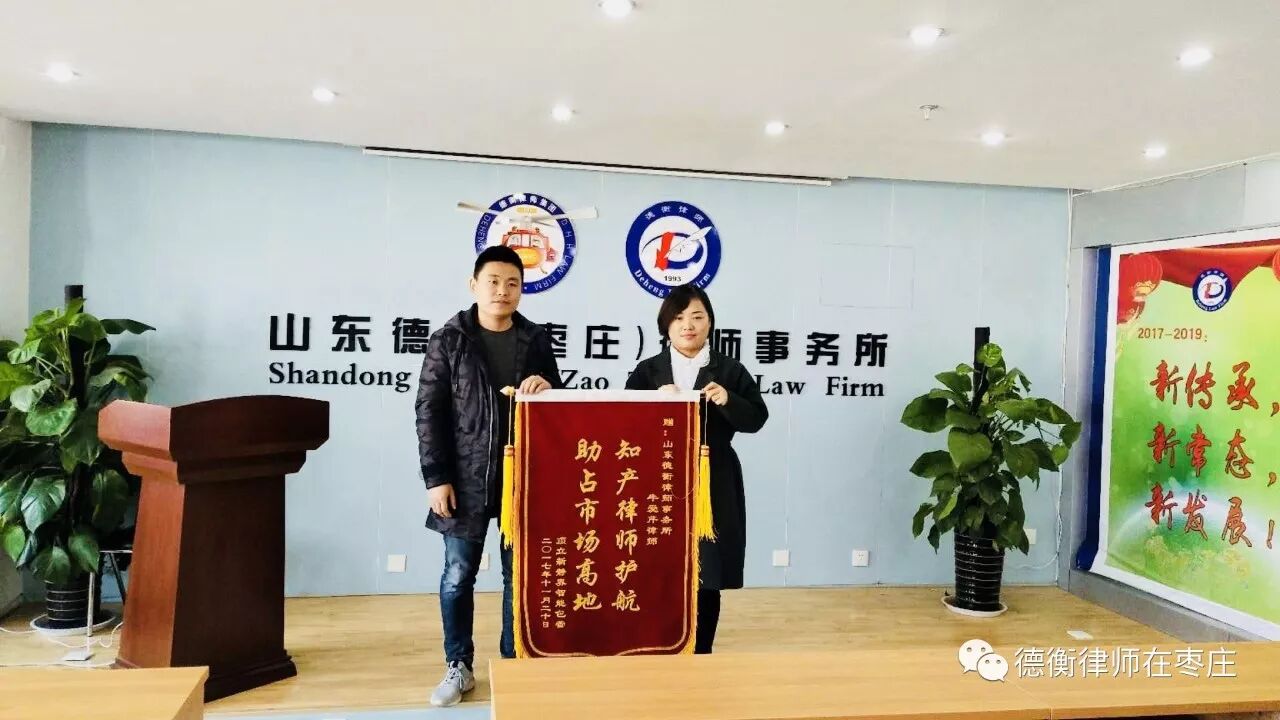2017年12月4日上午,枣庄新静界装饰材料有限公司两位负责人顾兴根、宋振江向我所冯克法律师、牛爱芹律师锦旗,表达感谢之情。