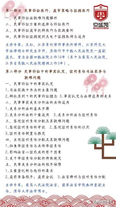京盛凯枣庄法律培训中心第九期培训“民事诉讼技巧、庭审策略、证据技巧暨事实认定、证明责任司法实务与疑难问题研讨班”将于1月27日-28日在我所视频会议室举行,江苏青创律师事条所律师、江苏师范大学法律硕士研究生导师、原徐州市中级人民法院民一庭副庭长王松,最高人民法院法官、国家法官学院教研室副主任、清华大学法学博士将进行精彩授课。