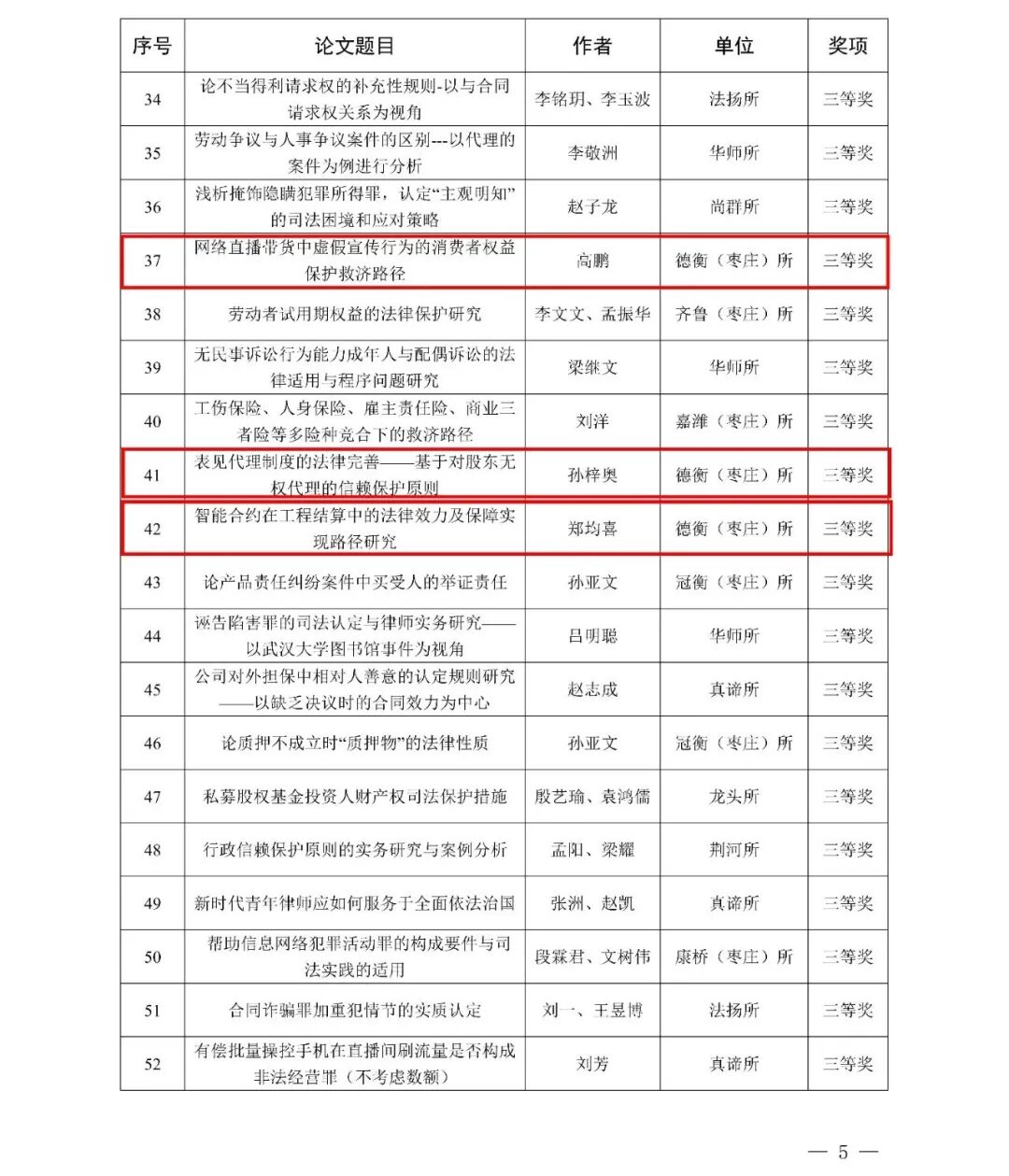 在个人奖项评选中,德衡(枣庄)所律师凭借精准的法律视角、扎实的理论功底和丰富的实践经验,交出了亮眼答卷:一等奖:任颜松律师的《不动产信托登记制度对财富传承的影响—— 以京沪试点为例》,聚焦财富传承领域的制度创新,为相关实务提供了极具价值的参考路径;二等奖:程元玖律师的《破产法语境中一人公司股东责任的规定与不足》、任颜松与刘相旋律师助理合著的《我国公益信托税收优惠制度的现状、问题与完善》,分别从破产法、信托法等多个领域切入,深入剖析行业痛点,提出切实可行的解决方案;三等奖:高鹏律师的深入剖析《网络直播带货中虚假宣传行为的消费者权益保护救济路径》、孙梓奥律师助理的《表见代理制度的法律完善—— 基于对股东无权代理的信赖保护原则》、郑均喜律师的《智能合约在工程结算中的法律效力及保障实现路径研究》,紧扣数字经济、市场交易等热点场景,展现了律师对新型法律问题的敏锐洞察与专业应对。每一份荣誉的背后,都是德衡律师对法律事业的执着追求,更是对“专业、高效、诚信、勤勉” 执业理念的生动践行。此次获奖,既是对我所律师专业能力的肯定,也是对全所学术研究氛围的激励。未来,山东德衡(枣庄)律师事务所将珍惜“优秀组织奖” 这一荣誉,以获奖律师为榜样,持续搭建理论研究与实务交流平台,鼓励更多律师深耕专业领域、勇于探索创新。我们将始终坚守法律初心,以更深厚的理论积淀、更精湛的执业技能,为客户提供优质高效的法律服务,为枣庄法治建设与经济社会高质量发展贡献更大的德衡力量!再次向所有获奖律师表示热烈祝贺!让我们携手共进,在法律追梦路上再创佳绩!