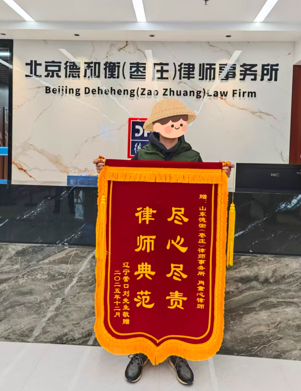 2025年12月9日,委托人从东北给山东德衡(枣庄)律师事务所肖童心律师送来一面标有:“尽心尽责,律师典范”的锦旗,以表达诚挚的感谢。