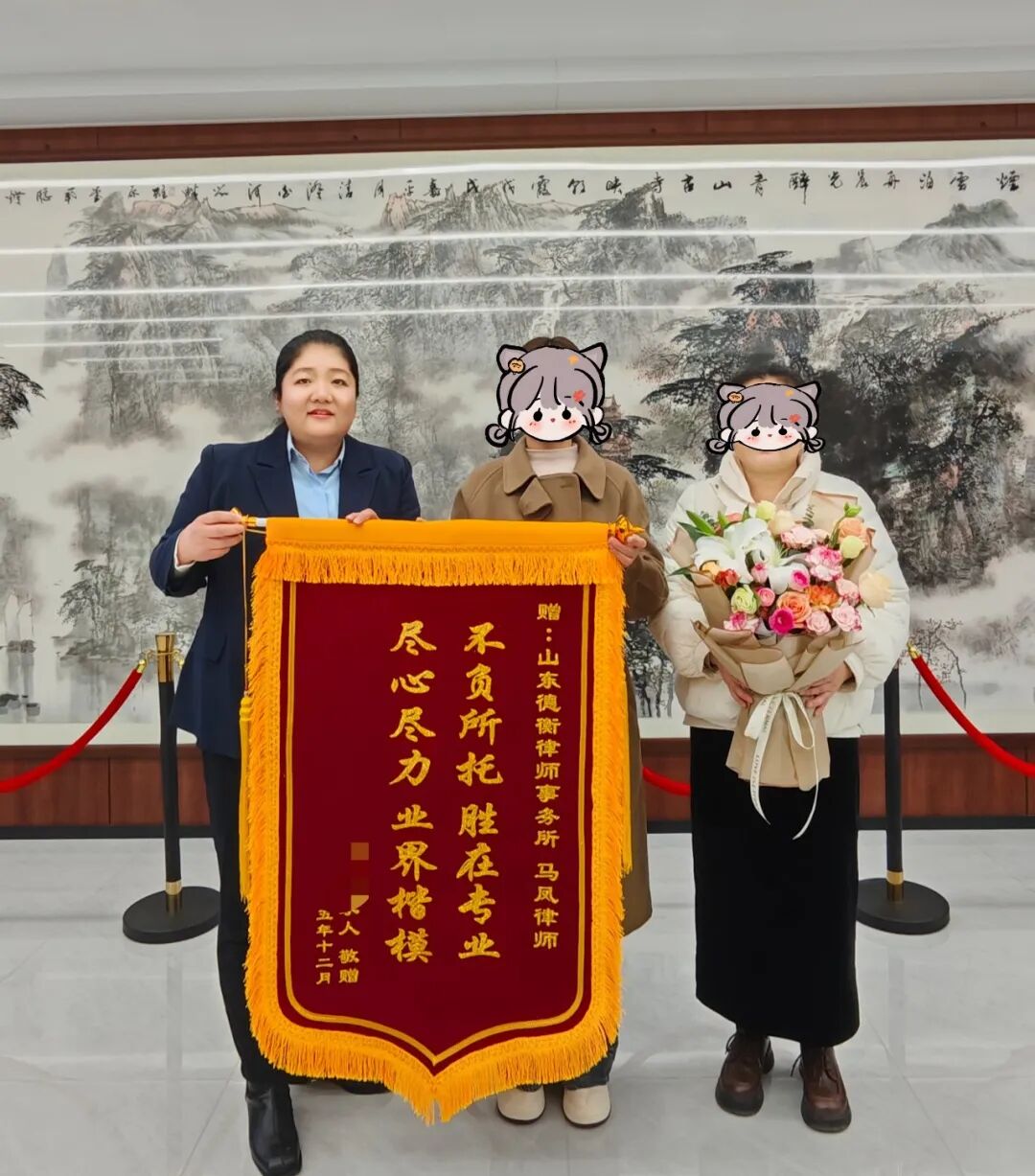 2025年12月17日,委托人及当事人到访山东德衡(枣庄)律师事务所,向马凤律师赠送鲜花和锦旗,感谢马凤律师在案件办理过程中的专业严谨、细心负责。